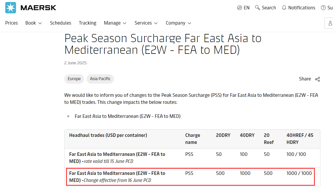 馬士基宣布遠東亞洲至地中海E2 W的旺季附加費PSS,自6月16日起生效,調整為20英尺箱征收500美金、40英尺箱/45英尺箱征收1000美金。