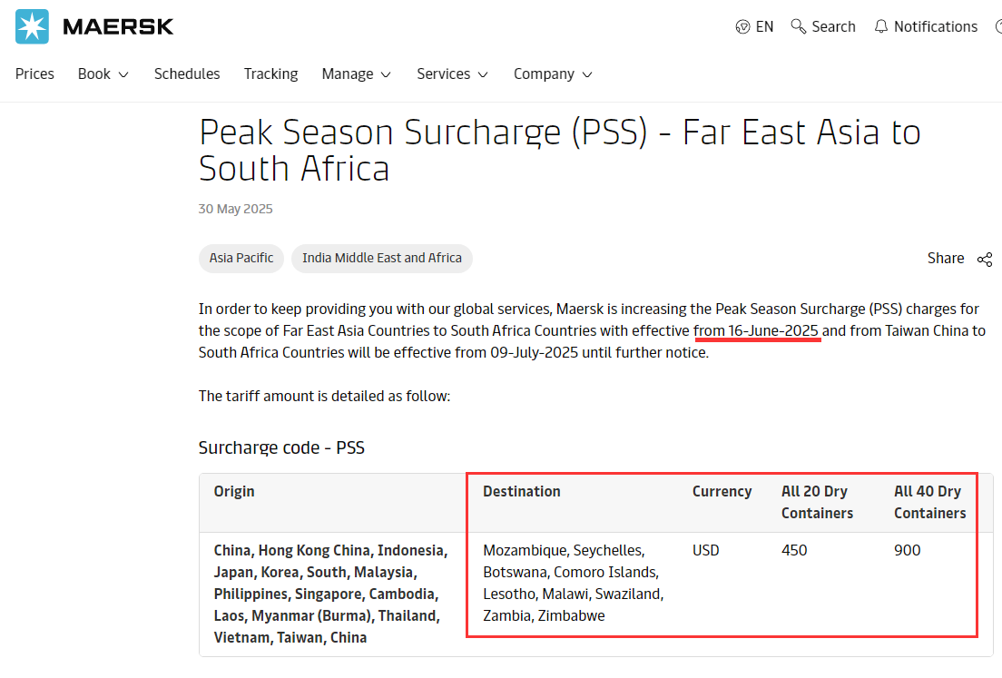 馬士基宣布將提高從遠東亞洲國家到南非國家的旺季附加費PSS,自2025年6月16日起生效,從中國臺灣到南非國家將于2025年7月9日生效,直至另行通知。所有20英尺箱征收450美金,40英尺箱征收900美金。